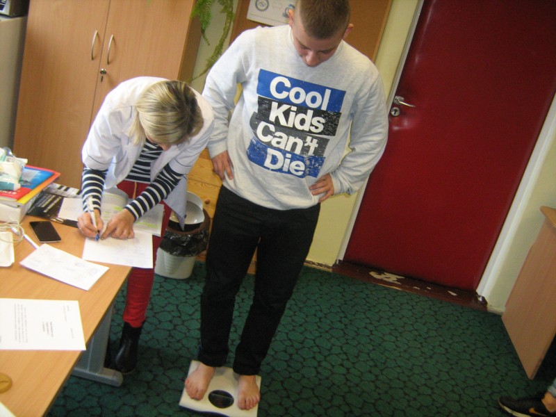 We wtorek i w środę przeprowadzono akcję „Miej odwagę stań na wagę!”, podczas której uczniowie i pracownicy szkoły mieli możliwość zważenia się na profesjonalnej wadze, która dodatkowo wyznaczała wskaźnik BMI oraz zawartość wody i tłuszczu w organizmie. Chętnych do pomiarów nie brakowało - badania cieszyły się bardzo dużym zainteresowaniem.