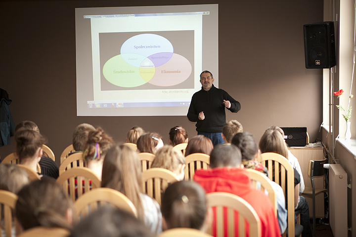 Uczniowie goleniowskiego liceum mieli okazję wysłuchać wykładu dr Jacka Kaliciuka na temat zrównoważonego rozwoju. Wykład ten miał na celu uświadomić młodzieży jak ważne jest rozsądne korzystanie z wody, gdyż jej nadmierne, a czasami niekonieczne zużywanie może prowadzić do jej znacznego deficytu na naszej planecie w perspektywie mniej więcej 50 lat. Prelegent zwrócił uwagę młodzieży na to, jak ważna jest odpowiedzialność oraz przyszłościowe myślenie, zwłaszcza wśród władz na wszelkich szczeblach. Zachęcał do samodzielnego myślenia i wypracowywania sobie na każdy temat własnego zdania.