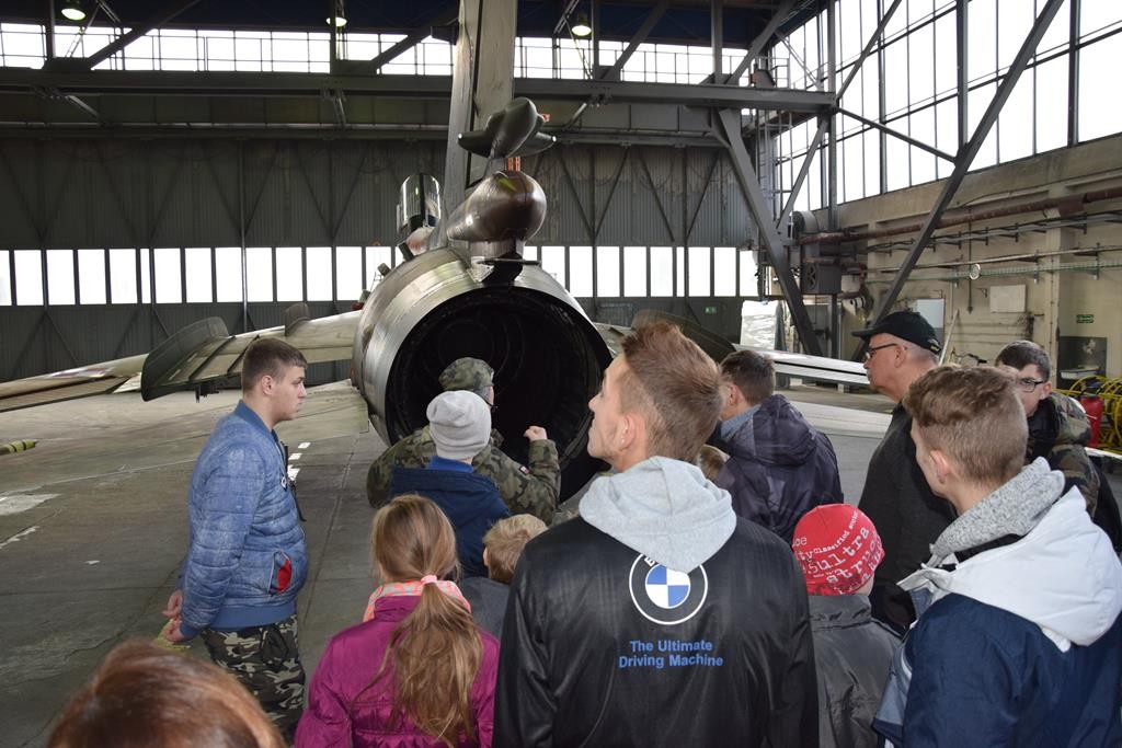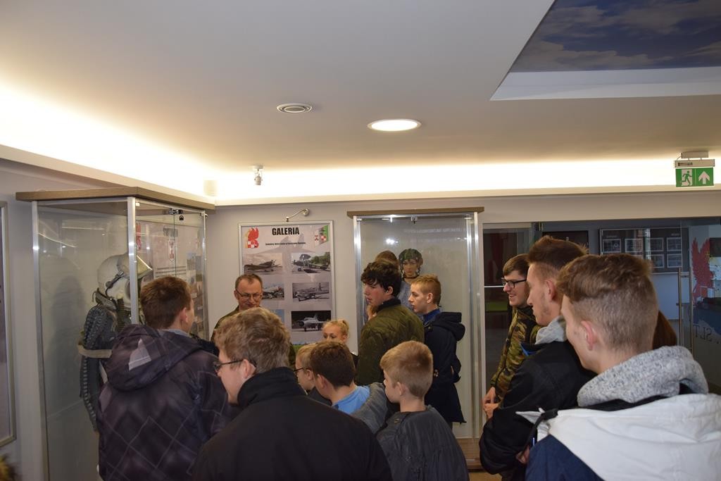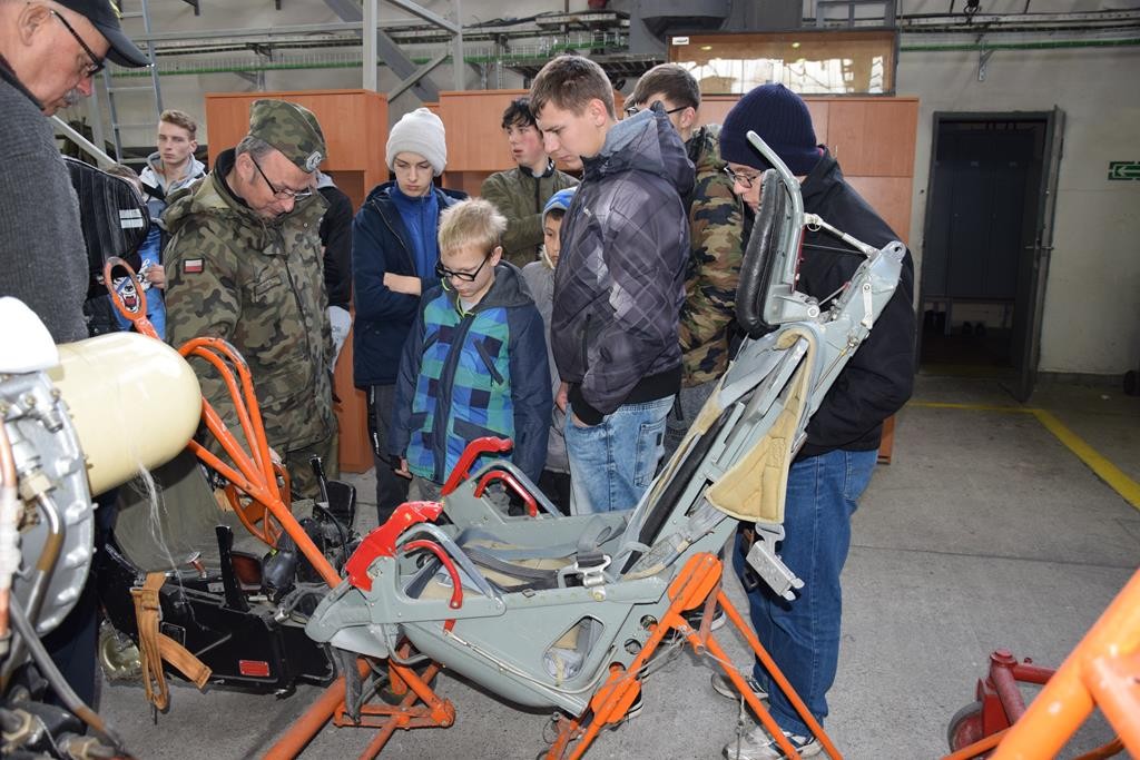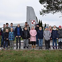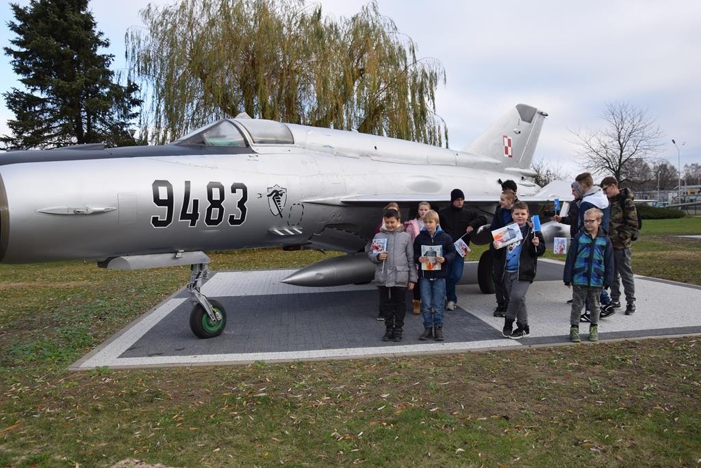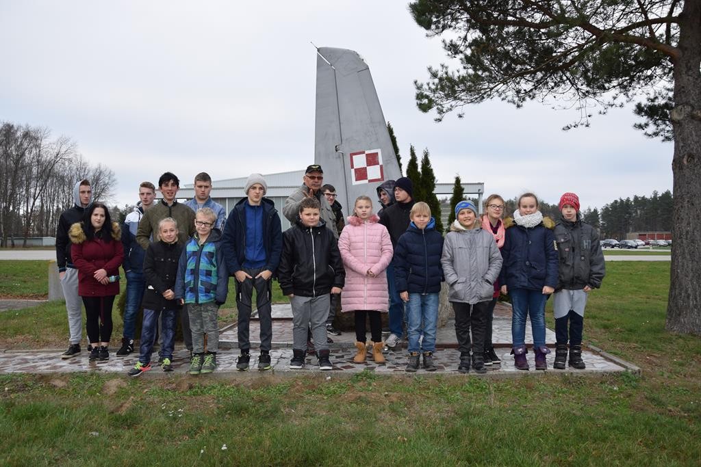 Przed wejściem na lotnisko czekał na nas przewodnik, pan Jacek Daśko, rzecznik prasowy Bazy. Wycieczka rozpoczęła się od wizyty w Sali Tradycji, w której dzieci zobaczyły modele samolotów, mundury galowe i ćwiczebne żołnierzy, sztandary, makietę całego lotniska oraz zdjęcia. Tam pan przewodnik zapoznał dzieci z historią 21. BLT, opowiedział o dowódcach Bazy i codziennej służbie w tej jednostce wojskowej. Uczniowie z zaciekawieniem słuchali opowieści oraz zadawali mnóstwo pytań. Następnie udaliśmy się na płytę lotniska oraz zwiedzaliśmy hangary służące do napraw samolotów. Tam z bliska mogliśmy się przyjrzeć stojącym statkom powietrznym. Każdy miał możliwość siąść za sterami samolotu ISKRA. Uczniowie otrzymali skromne upominki związane z 21.Bazą Lotnictwa Taktycznego. Wycieczka dostarczyła dzieciom mnóstwo wrażeń. Serdeczne podziękowania dla Stowarzyszenia NASZE SZANSE , które sfinansowało nam dojazd w obie strony.