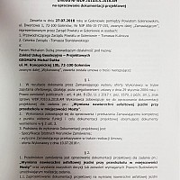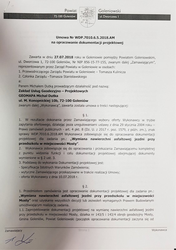 Starosta Goleniowski Tomasz Kulinicz informuje, iż dokumentacja na remont odcinka drogi powiatowej w okolicach przedszkola, w miejscowości Mosty jest już realizowana. Modernizacja tej części drogi będzie polegać przede wszystkim na wymianie nawierzchni, co znacznie poprawi jej standard, który w obecnej chwili jest w złym stanie. Przed podpisaniem umowy odbyło się spotkanie konsultacyjne z wykonawcą dokumentacji, w którym uczestniczył Starosta Goleniowski Tomasz Kulinicz oraz Radna Powiatu w Goleniowie Beata Baryluk-Starczewska wnioskodawca wykonania remontu, którego celem było omówienie uwarunkowań związanych z realizacją zadania oraz rozwiązań projektowych i uwzględnienia ich w dokumentacji. Wykonawcą dokumentacji jest lokalna firma z Goleniowa - Zakład Usług Geodezyjno-Projektowych Geomapa Michał Dutka. Celem nadrzędnym realizacji przedmiotowej inwestycji drogowej jest przede wszystkim poprawa bezpieczeństwa i komfortu jazdy dla kierowców, a także polepszenie parametrów technicznych i eksploatacyjnych odcinka drogi objętego przebudową.