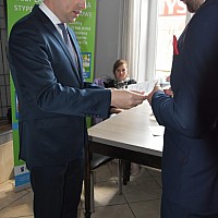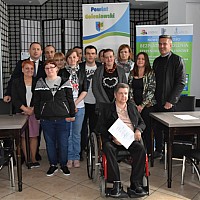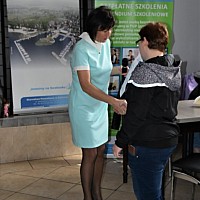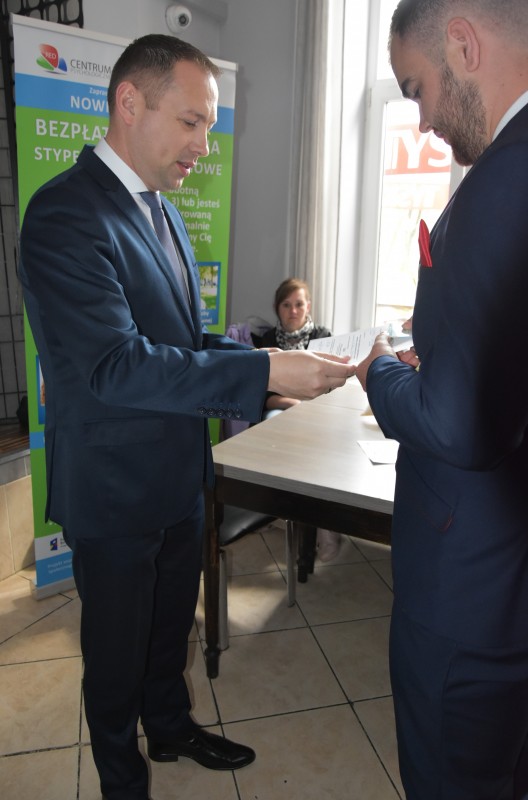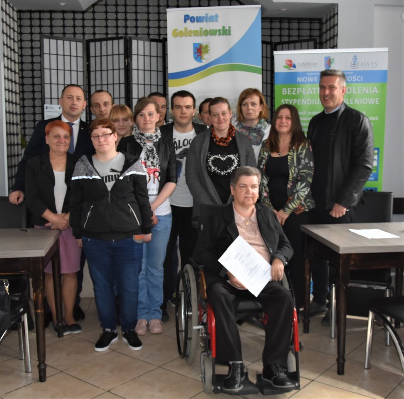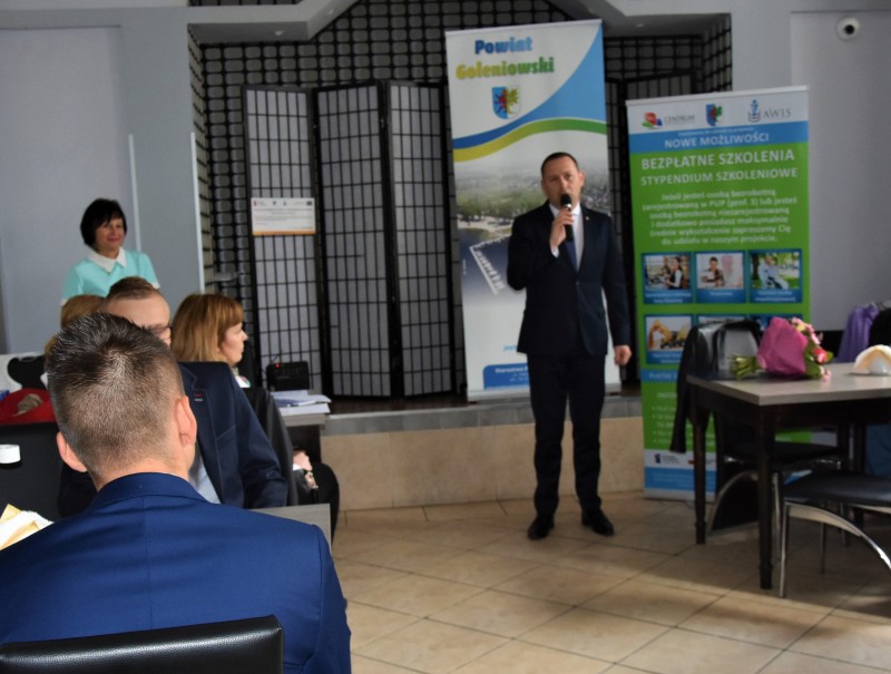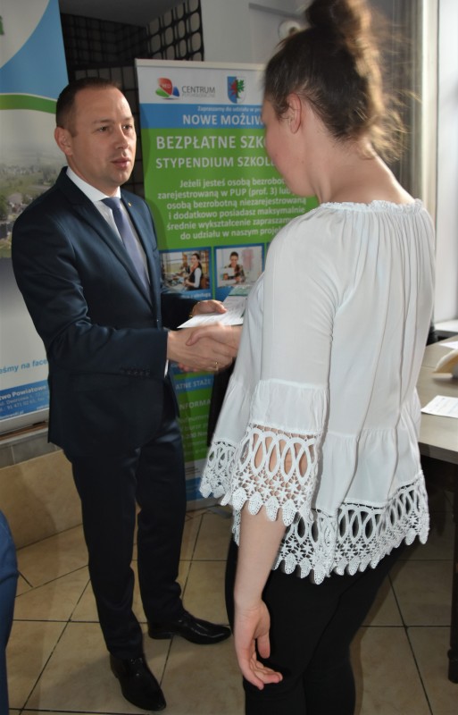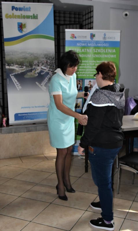 W tym samym dniu zostały wręczone świadectwa ukończenia kursu sprzedawcy uzyskane przez beneficjentów w ramach projektu pn. "Nowe możliwości" z działania 7.2 RPO WZ, które wręczył Starosta Powiatu oraz Pan Tobiasz Lubczyński. Projekt był realizowany przez Stowarzyszenie Akademia Wspierania Inicjatyw Społecznych AWIS w partnerstwie z Powiatem Goleniowskim.