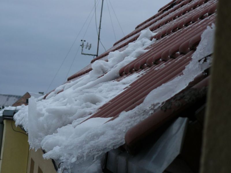 Usuwanie zatorów śnieżnych z dachu starostwa.