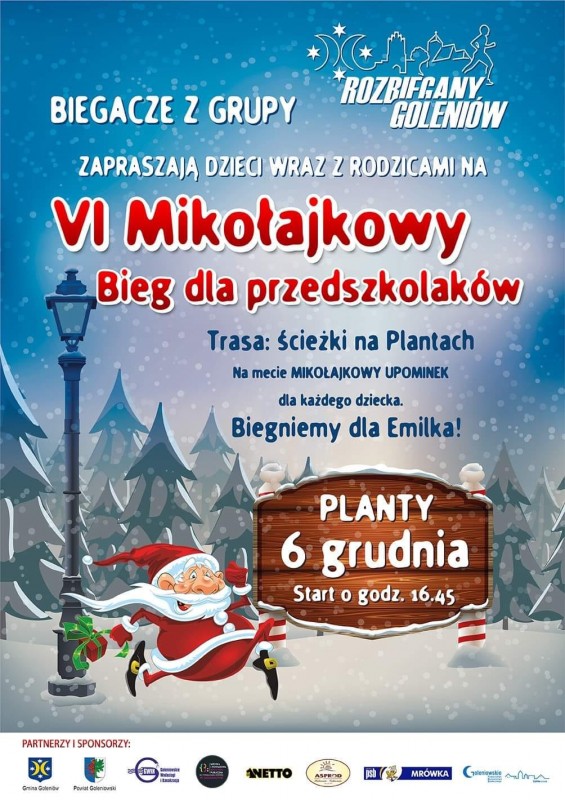 Biegacze z grupy "Rozbiegany Goleniów" zapraszają dzieci wraz z rodzicami na 6. Mikołajkowy Bieg dla przedszkolaków ścieżkami na Plantach. Na mecie mikołajkowy upominek dla każdego dziecka! W tym roku wszyscy biegną dla Emilka. Start o godz. 16.45 – Planty w Goleniowie.