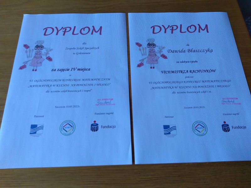 W dniu 10 marca 2022 r. uczniowie Branżowej Szkoły I Stopnia nr 1 w Goleniowie Nikola Garbaciak i Dawid Błaszczyk brali udział w VI Ogólnopolskim Konkursie Matematycznym „Matematyka w kuchni na poważnie i wesoło” organizowanym przez SOSW nr 2 w Szczecinie.