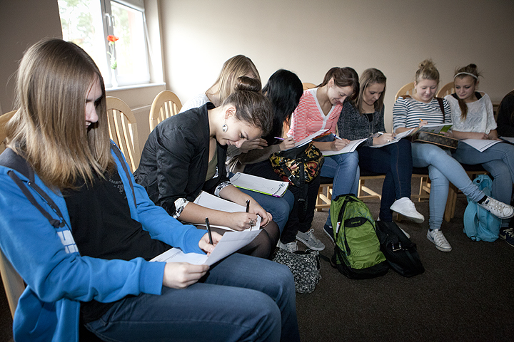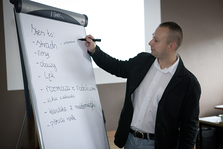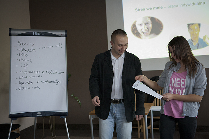 Druga część warsztatów poświecona była redukcji stresu. Uczniowie uczyli się rozpoznawać w sobie sygnały narastającego stresu, dowiedzieli się, jaki jest optymalny poziom stresu oraz mogli poćwiczyć sposoby redukcji napięcia pod okiem prowadzącego.