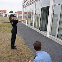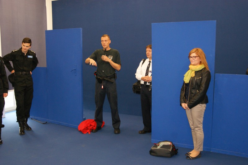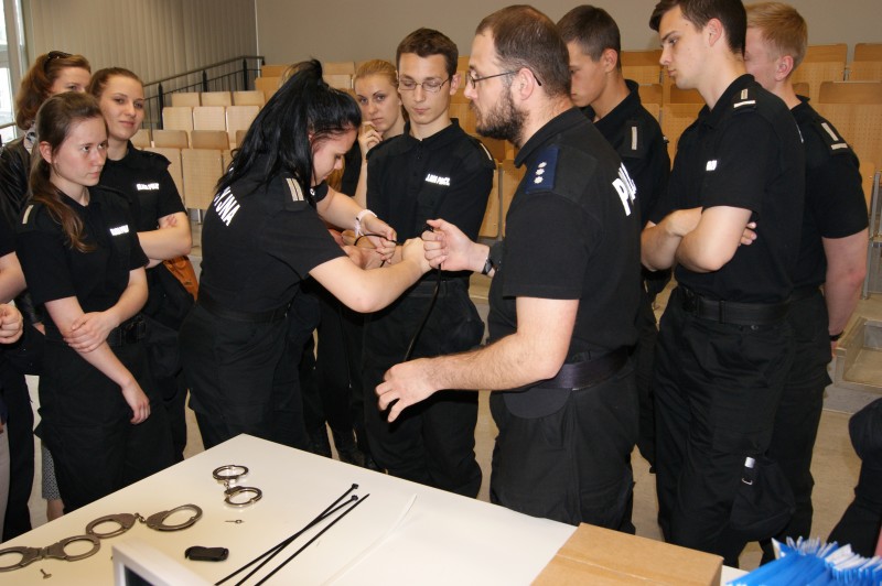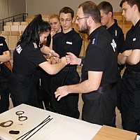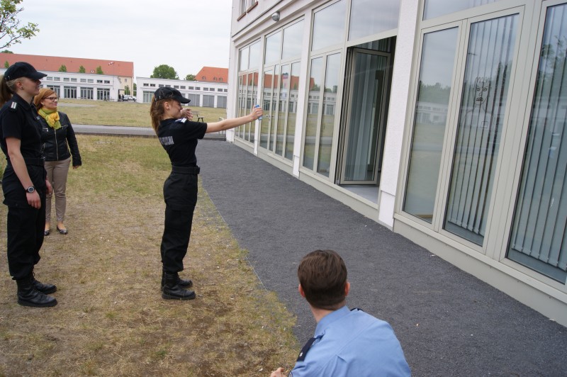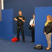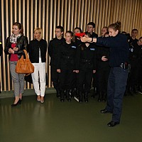 Kolejnym etapem spotkania był tzw. Einsatztraining, czyli trening prewencji. Uczniowie zapoznali się z podstawowym sprzętem, stosowanym na co dzień przez niemieckich policjantów, np. kajdanki, kajdanki jednorazowe czy gaz. Na własnej skórze uczniowie wypróbowali również działanie gazu pieprzowego, wchodząc do pomieszczenia symulacyjnego, w którym gaz został rozpylony.