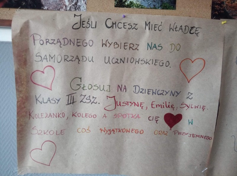 Wrzesień to gorący czas wyborów do Rady Samorządu Uczniowskiego. Kandydaci przygotowali plakaty, na których umieścili świetne hasła i swoje programy wyborcze. Na korytarzach szkolnych pojawiły się barwne plakaty wykonane przez uczniów. Społeczność szkolna miała nie lada orzech do zgryzienia. Kandydaci zaproponowali wiele ciekawych pomysłów i obietnic. Spośród 9 kandydatów szkoły podstawowej i 11 z Gimnazjum oraz szkół ponad gimnazjalnych społeczność szkolna wybrała swoich przedstawicieli: Andżelikę Sulikowską Miłosza Barcikowskiego Sarę Sochacką Filipa Dudzińskiego. Opiekunami Samorządu tak jak w poprzednim roku zostały Panie: Diana Doszczeczko-Biczkowska, Monika Jastrzębska, Agata Januszko i Natalia Domaradzka. Serdecznie gratulujemy i życzymy mnóstwo energii oraz zapału do pracy w roku szkolnym 2018/2019.