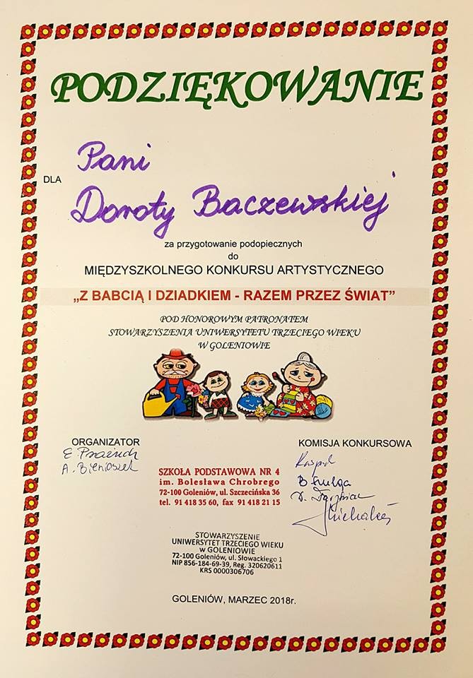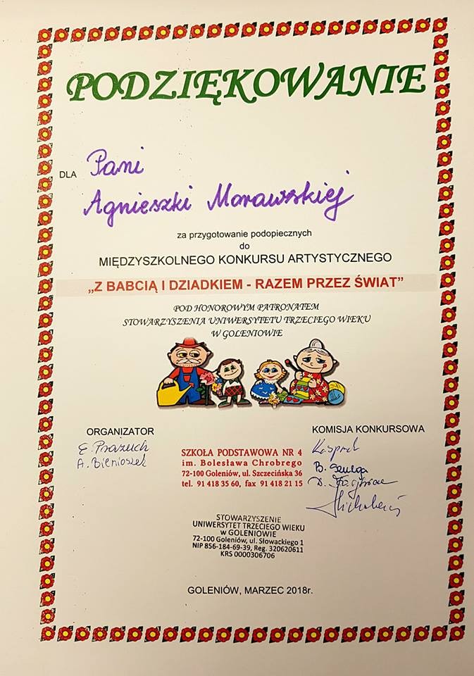 Uczniowie klas I-VII Zespołu Szkół w Goleniowie brali udział w międzyszkolnym konkursie artystycznym „Z BABCIĄ I DZIADKIEM – RAZEM PRZEZ ŚWIAT” organizowanym przez Szkołę Podstawową nr 4 im. Bolesława Chrobrego pod honorowym patronatem Stowarzyszenia Uniwersytetu Trzeciego Wieku w Goleniowie. W dniu 17 kwietnia 2018r w Miejskiej Bibliotece im. C. K. Norwida w Goleniowie odbyło się uroczyste wręczenie nagród i wyróżnień. Nagrody wręczali przedstawiciele Stowarzyszenia Uniwersytetu Trzeciego Wieku, którzy aktywnie włączyli się do prac związanych z konkursem. Oto laureaci: