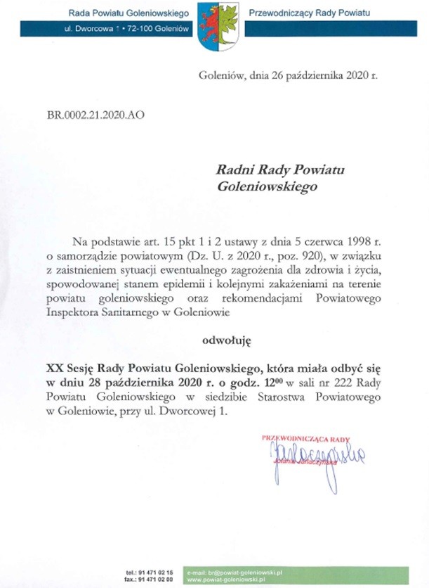 XX sesja Rady Powiatu Goleniowskiego - odwołana