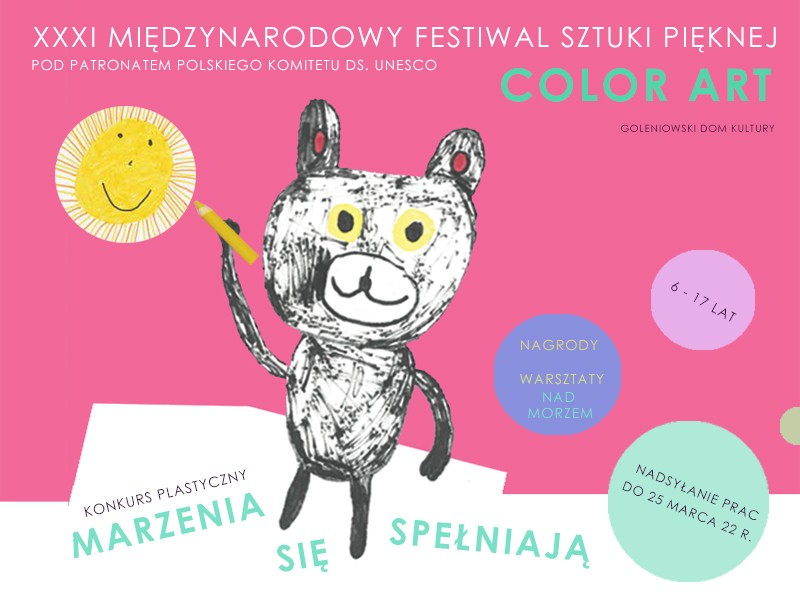 Temat tegorocznej edycji XXXI Festiwalu Sztuki Pięknej Color Art "Marzenia się spełniają" jest odpowiedzią na poszukiwanie uniwersalnego łącznika, części wspólnej pomiędzy sposobem postrzegania świata przez dzieci na całym świecie. Do udziału w konkursie zapraszamy wszystkie chętne dzieci oraz młodzież. Przyjmowane są zgłoszenia od osób indywidualnych, placówek edukacyjnych, instytucji kultury oraz szkół. Laureaci konkursu wraz z opiekunami są zapraszani do udziału w kilkudniowych warsztatach artystycznych w ramach finału Festiwalu Color Art, otrzymują również nagrody rzeczowe oraz katalogi.