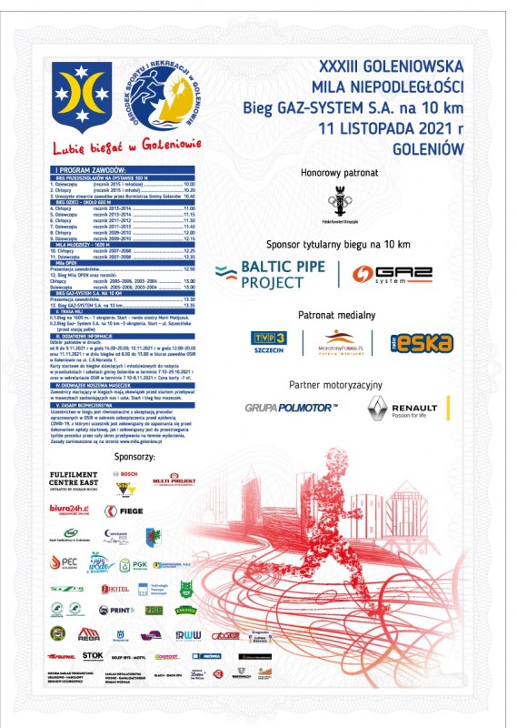 Starosta Goleniowski informuje o czasowej zmianie organizacji ruchu w związku z organizacją XXXIII Goleniowskiej Mili Niepodległości i Biegu GAZ – SYSTEM S.A na drogach powiatowych nr 4103Z ul. Przestrzennej, 4204Z ul. M. Konopnickiej, nr 4208Z ul. J. Matejki, nr 4222Z ul. Szczecińskiej, 4212Z ul. Piaskowej oraz drogach gminnych ul. Sportowej, ul. Gen. W. Andersa, ul. Lipowej, ul. Akacjowej, ul. C.K. Norwida w miejscowości Goleniów. Zmiana obowiązuje w dniu 11 listopada 2021 r. w godzinach od 9.30 – 15.30.