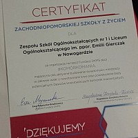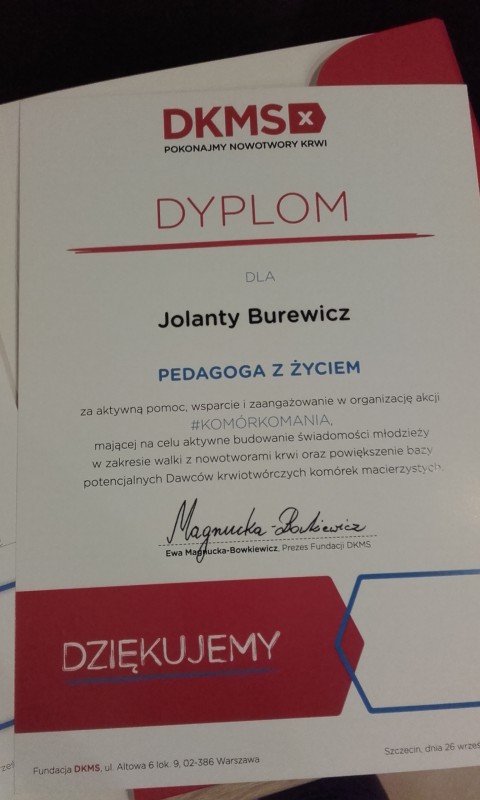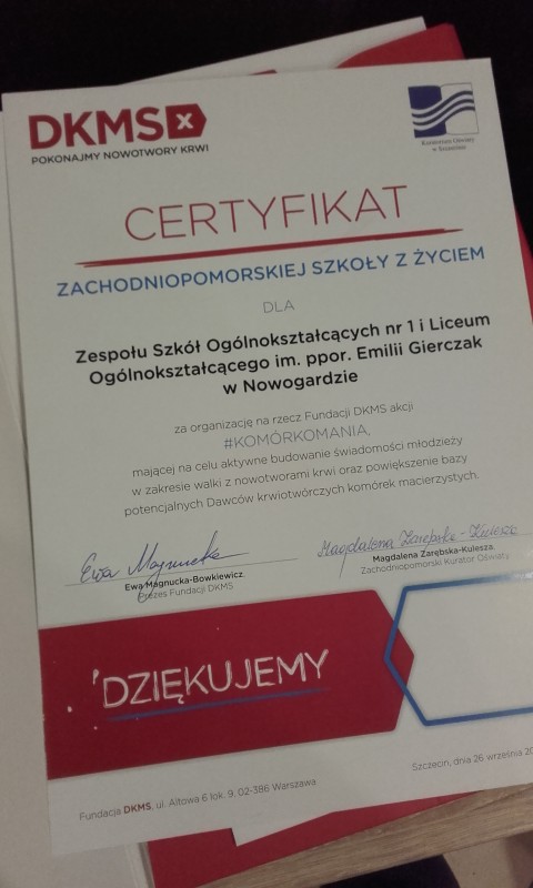 26 września, w Szczecinie, odbyło się podsumowanie akcji ZACHODNIOPOMORSKA #KOMÓRKOMANIA. To II edycja akcji, do której przyłączyła się także nasza szkoła. Podczas gali, koordynator szkolnej akcji p. Jolanta Burewicz oraz p. Jolanta Machut wraz z ucz. Sandrą Lewandowską odebrały Certyfikat „Szkoły z Życiem”, przyznany przez Zachodniopomorskiego Kuratora Oświaty oraz Fundację DKMS.