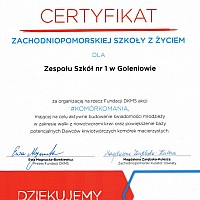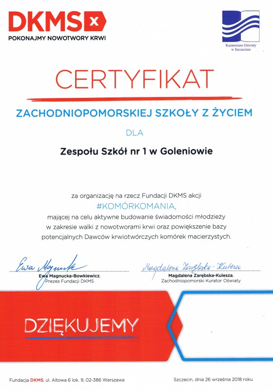 26 września w Sali Rycerskiej Zachodniopomorskiego Urzędu Wojewódzkiego w Szczecinie odbyło się podsumowanie akcji ZACHODNIOPOMORSKA #KOMÓRKOMANIA. To już II edycja, która odbyła się w ramach porozumienia zawartego pomiędzy Zachodniopomorskim Kuratorem Oświaty- panią Magdaleną Zarębską – Kuleszą a Fundacją DKMS. Zespół Szkół nr 1 w Goleniowie po raz drugi otrzymał certyfikat Szkoła z życiem.