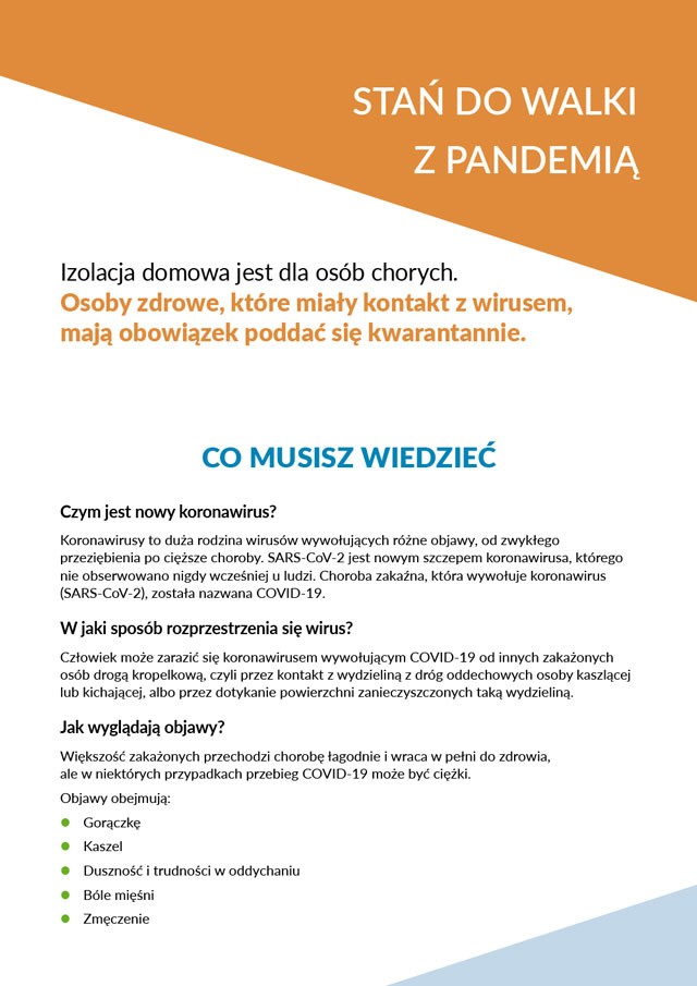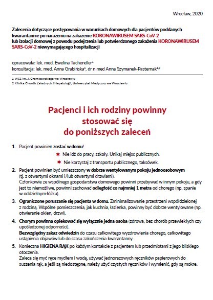 Poniżej przedstawiamy przygotowane przez lekarzy ulotki dla osób zawierające zalecenia dotyczące postępowania w warunkach domowych dla pacjentów poddanych kwarantannie po narażeniu na zakażenie KORONAWIRUSEM SARS-CoV-2 lub izolacji domowej z powodu podejrzenia lub potwierdzonego zakażenia KORONAWIRUSEM SARS-CoV-2 niewymagającego hospitalizacji.