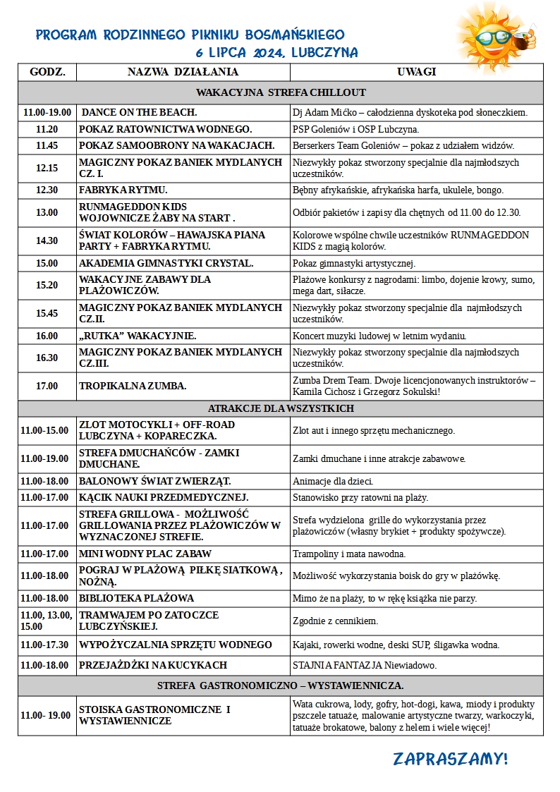 Zapraszamy na Piknik Bosmański 6 lipca na plaży w Lubczynie - 03.07.2024 r.
