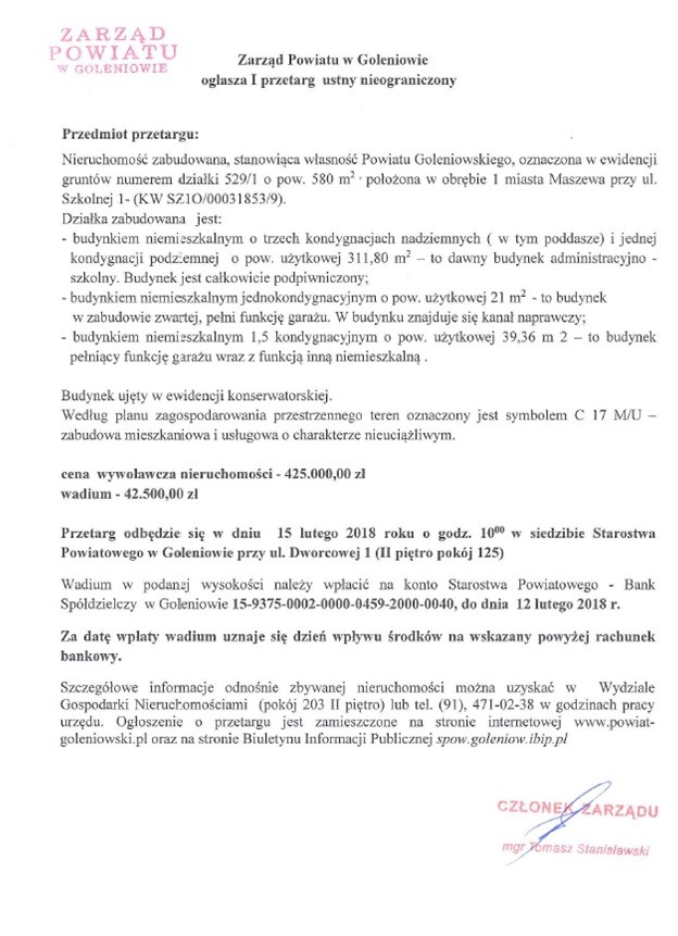 ZARZĄD POWIATU W GOLENIOWIE OGŁASZA PRZETARG