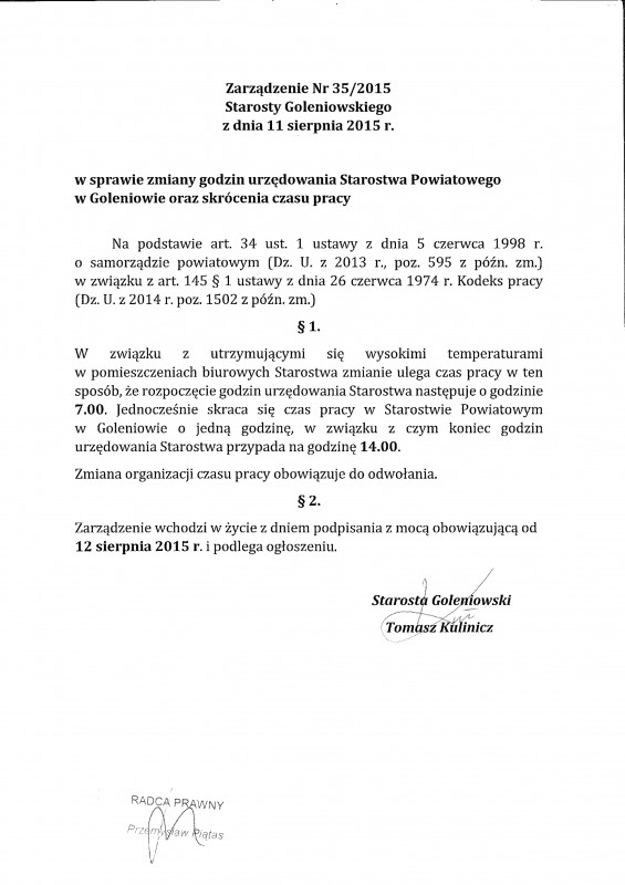 Zarządzenie Starosty Goleniowskiego w sprawie zmiany godzin urzędowania Starostwa Powiatowego w Goleniowie oraz skrócenia czasu pracy