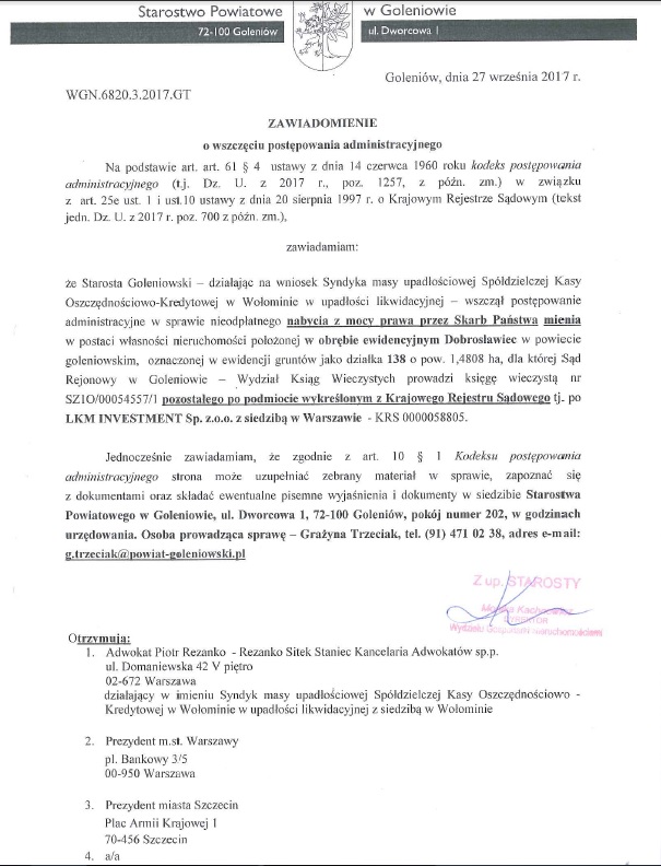 Starosta Goleniowski wszczął postępowanie administracyjne w sprawie nieodpłatnego nabycia z mocy prawa przez Skarb Państwa mienia w postaci własności nieruchomości położonej w obrębie eidencyjnym Dobrosławiec.