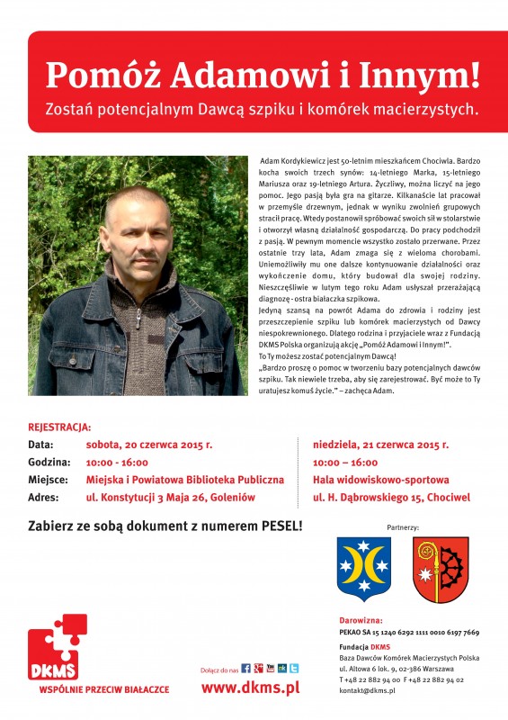 20 czerwca w Miejskiej i Powiatowej Bibliotece Publicznej w Goleniowie odbędzie się akcja rejestracji potencjalnych Dawców komórek macierzystych krwi i szpiku – dedykowana panu Adamowi i innym pacjentom. Jedyną szansą na powrót Adama do zdrowia i rodziny jest przeszczepienie szpiku lub komórek macierzystych od Dawcy niespokrewnionego. Do tej akcji włączył się również Zespół Szkół nr 1 w Goleniowie.