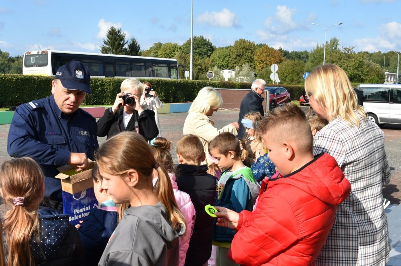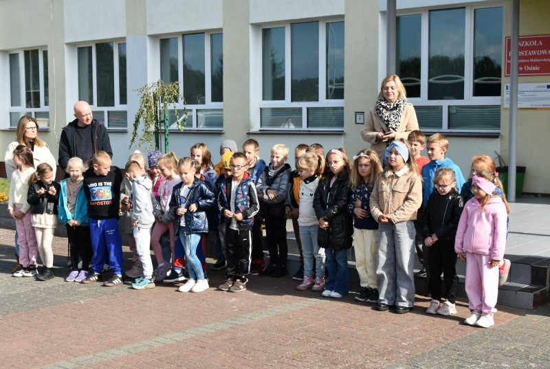Starosta Goleniowski Tomasz Stanisławski wspólnie z Wójtem Osiny Krzysztofem Szwedo rozdawali odblaski uczniom Szkoły Podstawowej im. Bronisława Malinowskiego w Osinie.